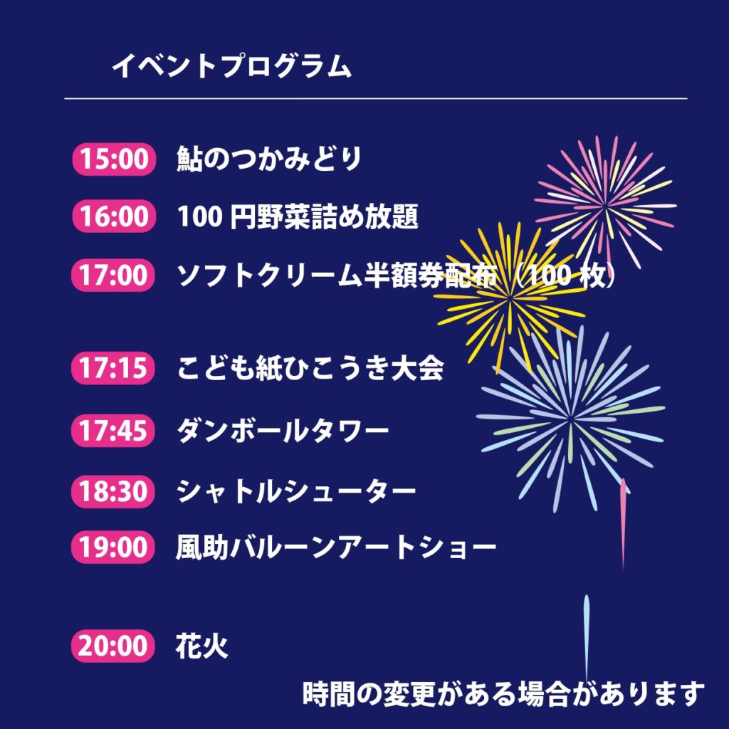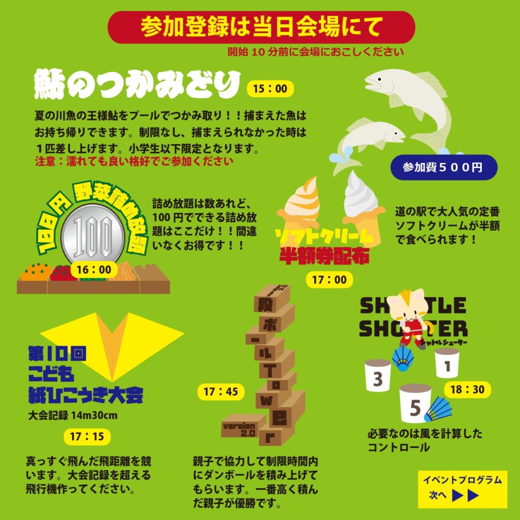 | プログラム | 10:00 ソフトクリーム半額券配布 15:00 鮎のつかみどり 16:00 100円野菜詰め放題 17:00 ソフトクリーム半額券配布 17:15 こども紙ひこうき大会 17:45 親子で挑戦!ダンボールタワー 18:30 シャトルシューター 19:00 風助バルーンアートショー 20:00 花火大会 ※時間の変更がある場合がございます。詳しくは当日会場にてご確認ください。 ●フード出店 ●国交省ダム管理課ダムジオラマ展示VRダム見学体験 |