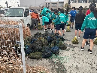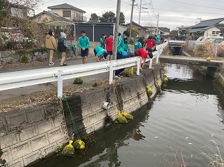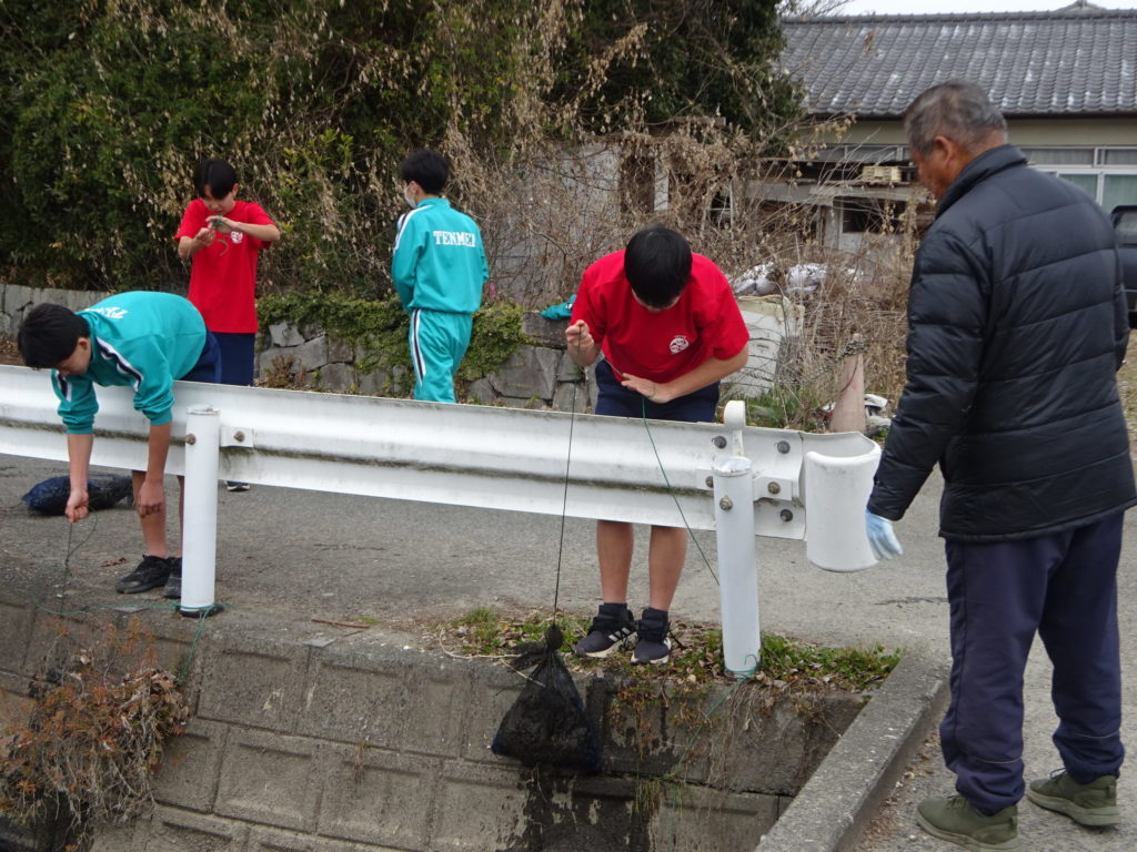 1月26日の6時間目、3年生の総合的な学習の時間に、学校周辺の水路へ1年前に設置した炭袋を回収し、今年度作成した新しい炭袋を投入しました。これは天明中学校で長年受け継がれている伝統行事で、炭袋によって水路を浄化し、きれいな環境を保つことを目的としています。生徒に話を聞くと、「1年前に入れた炭袋は重くて、においもきつかったです」「炭袋を取り出したとき、小さな魚がいました。新しい炭袋で水がもっときれいになればうれしいです」など、さまざまな声が聞かれました。卒業を間近に控えた3年生の笑顔が、とても印象的な一日でした。
