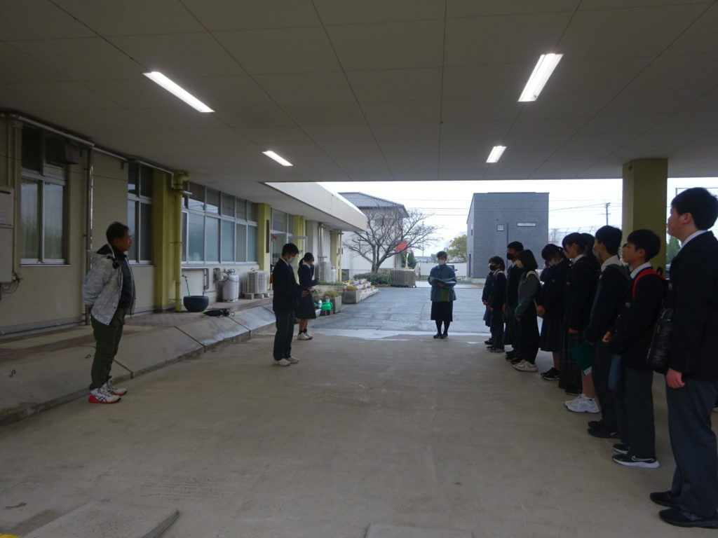 2月25日水曜日 8:30に中学校のピロティにて朝の挨拶です。