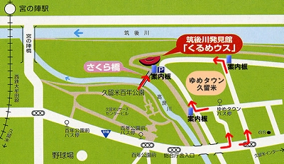 お手数をおかけしますが、「くるめウス」から河川敷を徒歩約5分の「宮ノ陣橋駐車場」をご利用くださいますようお願いいたします。