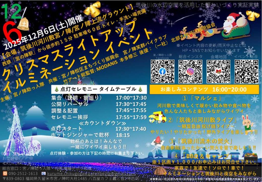 筑後川では現在「河川敷」にてイルミネーションも行われています。当日は、イルミネーションを企画されている活動団体「宮ノ陣助っ人隊」さんから、イルミネーションの説明もありますので、楽しみにしていてくださいね。
