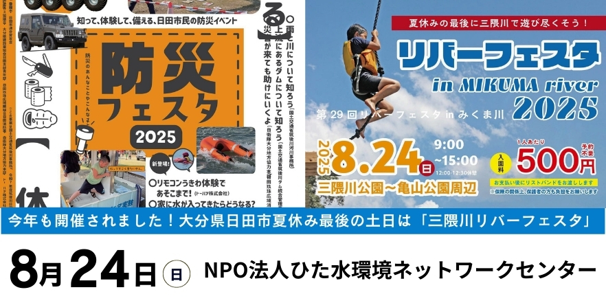 2025年8月24日(日)、大分県日田市の美しい三隈川公園にて、地域密着型の防災啓発イベント「防災フェスタ2025」と「リバーフェスタinみくま」が同時開催されます。