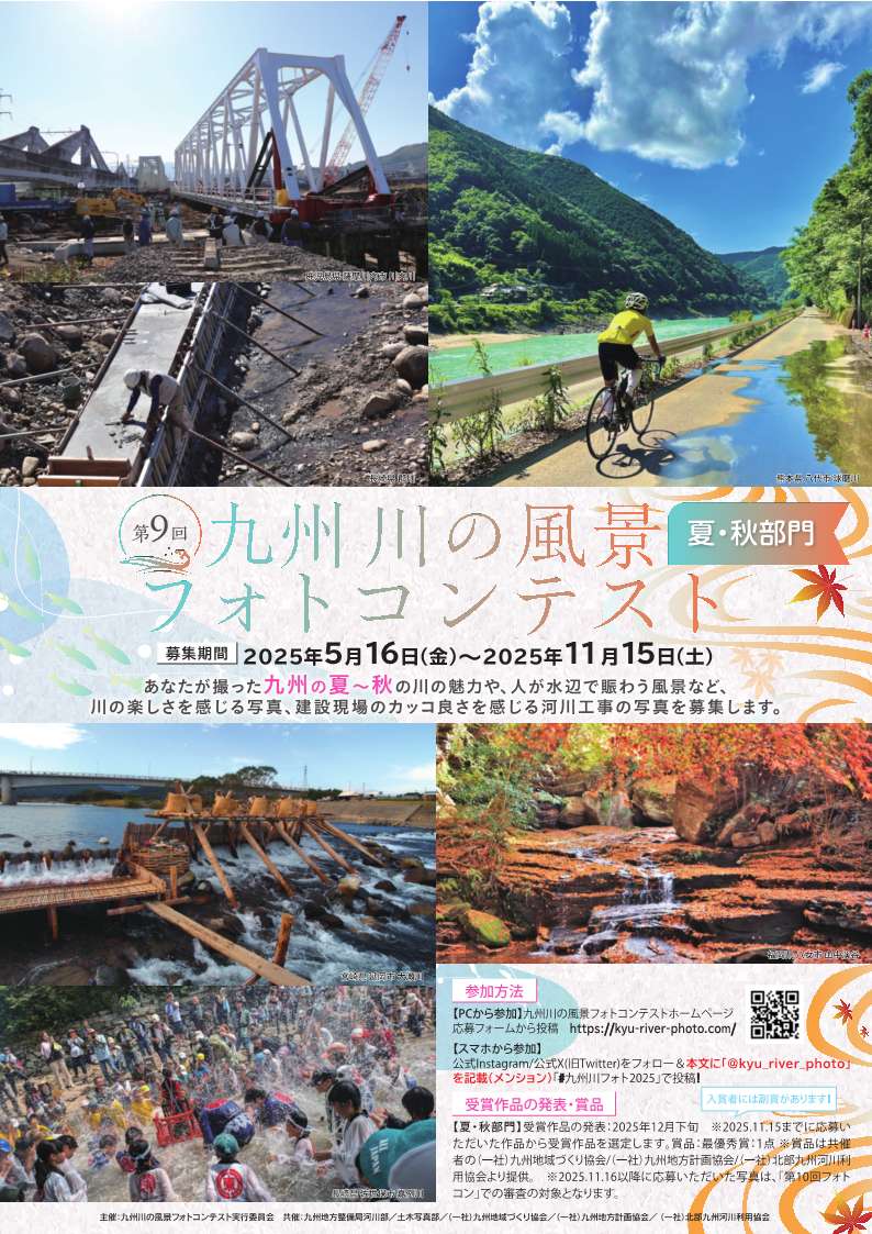 あなたが撮った、九州の川の魅力や川の楽しさを感じる写真。建設現場のカッコ良さを感じる河川整備の工事写真を、ぜひ応募してください。